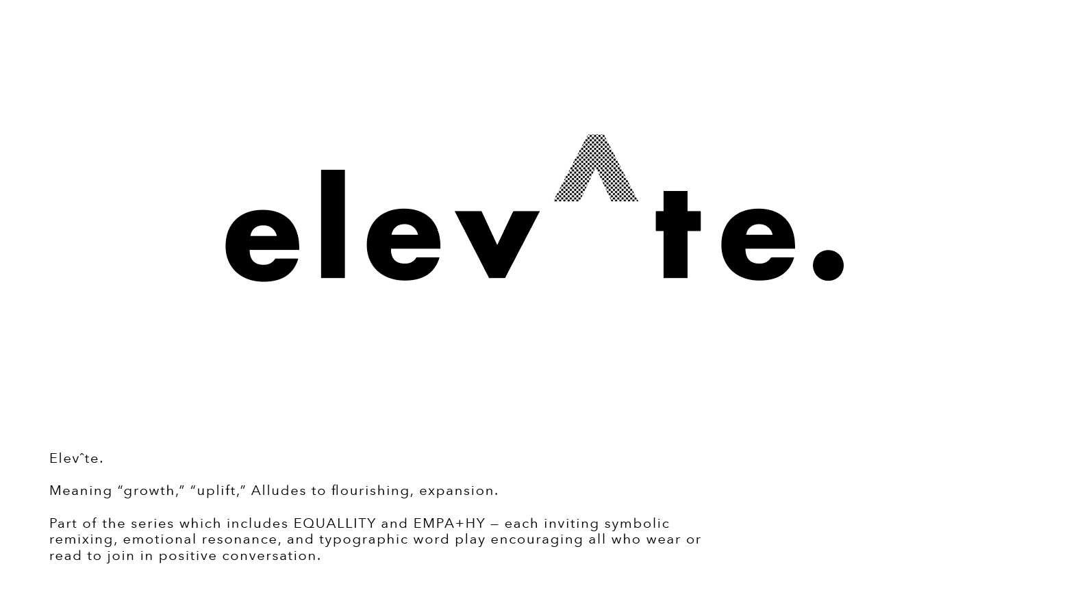 Equallity. Empa+hy. Elev^te. Each part of a series inviting symbolic remixing, emotional resonance, and typographic word play - encouraging all who wear or read to join in positive conversation.